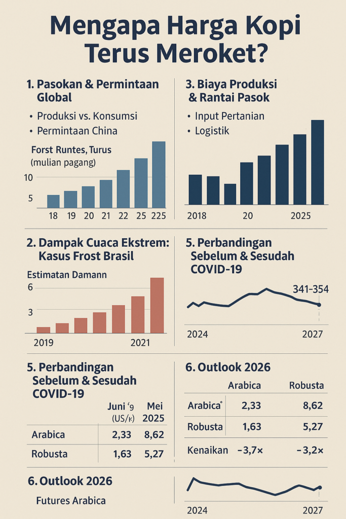 Dalam beberapa tahun terakhir, harga kopi global melonjak tajam—baik Arabika maupun Robusta—menyentuh rekor yang belum pernah terjadi sebelumnya. Dari level sebelum pandemi di bawah US $2–3 per kg, kini Arabika diperdagangkan pada ≈ US $8,62/kg, dan Robusta pada ≈ US $5,27/kg (Mei 2025). Lonjakan ini tidak terjadi tanpa sebab, melainkan perpaduan berbagai faktor fundamental, cuaca ekstrem, kebijakan, dan tren permintaan baru.