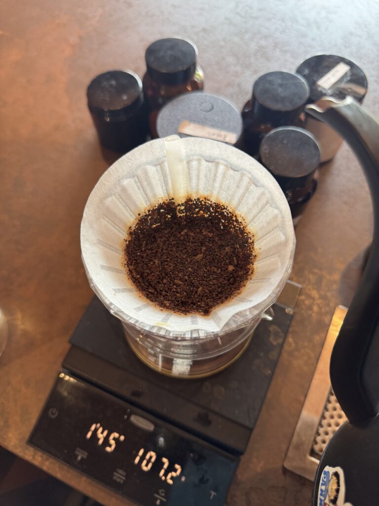 Lihat bed kopi setelah seduhan. Idealnya, permukaan kopi akan datar dan tidak ada lubang besar — tanda distribusi dan aliran air yang baik.